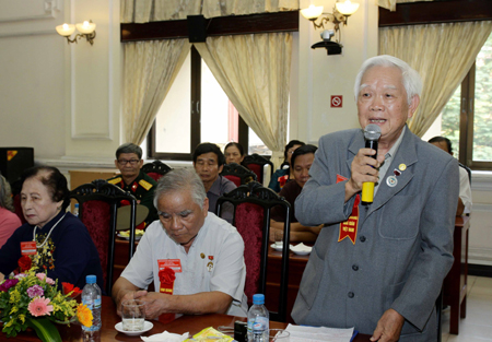 Tại buổi họp mặt, các đại biểu đã giãi bày niềm vui khi được Bộ Giáo dục và Đào tạo quan tâm, tạo điều kiện để các đời nhà giáo các vùng, miền trên cả nước gặp gỡ, giao lưu và tham gia chuyến đi “Về nguồn với Bác Hồ”; giao lưu truyền thống vơi chủ đề "Dù khó khăn đến đâu cũng phải thi đua dạy tốt, học tốt”. Ảnh: Minh Quyết - TTXVN Nhà giáo Thái Hồng Hảo, nguyên giảng viên Đại học Sư phạm 1, Huân chương kháng chiến chống Pháp hạng 3, huân chương kháng chiến chống Mỹ hạng 1, Huy hiệu 60 năm tuổi Đảng.