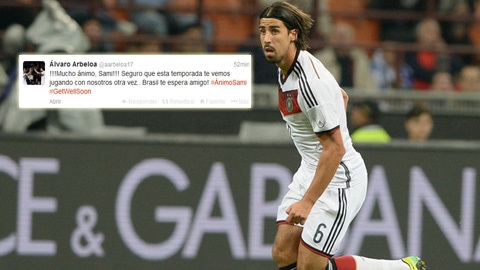 Khedira! Real và World Cup đang chờ đón bạn. Rất nhiều những lời chúc trên twitter mà đồng đội dành cho Khedira Phút 66 trận giao hữu giữa Italia và Đức trên sân San Siro đêm thứ Sáu vừa qua. Với hy vọng anh sẽ trở lại một cách sớm nhất". Khedira. Bạn của tôi. Tiền vệ Sami Khedira của ĐT Đức đã dính chấn thương khá nghiêm trọng ở đầu gối phải.