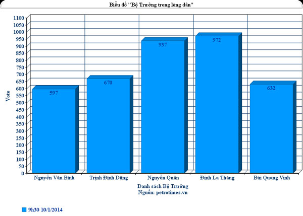 Lượng phiếu bầu dành cho “tư lệnh” ngành liên lạc luôn đứng trong top 3. Điều đó tùy thuộc vào sự bầu chọn của quý độc giả! bạn đọc có thể tham gia bầu chọn tại địa chỉ: botruongtronglongdan. Vn. Ngay từ khi hệ thống bầu chọn “Bộ trưởng trong lòng dân” của PetroTimes được mở. Bộ trưởng Đinh La Thăng đã luôn nhận được tình cảm của bạn đọc và có số phiếu bầu cao.